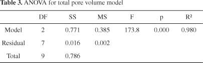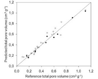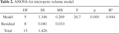 這個方程適用于微孔體積預測,用包含文獻中的數據和由我們獲得的數據的測試樣品進行評估。共測試了36個樣本。圖形比較(圖4)表明該模型具有良好的預測能力。該試驗樣品組的平均絕對誤差為0.05cm 3 g -1,平均相對誤差為16.4%。表2給出了模型的統計參數。