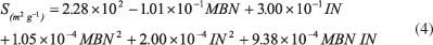 為了描述亞甲基藍和碘的數量相對于表面積的行為,使用二次模型。對于模型開發,Kennard-Stone算法從105個樣本中選擇了27個樣本并用于校準。樣品表面積從199到2105 m 2 g -1不等。亞甲基藍的數量在0到501毫克克每升之間,碘值從155到1670毫克克每升。建模后獲得的表面擬合(圖1)由公式4描述。