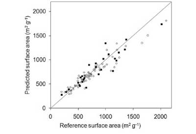KS算法被用于分離校準組和測試組中的樣品。該算法根據歐幾里德距離選擇樣本。前兩個選取的樣本彼此最遠。下面的樣本是通過與之前選擇的樣本的距離來選擇的。在校準組中進行不同樣品量的校準。校準中使用的樣本數量被選擇來生成顯示測試組樣本的最小誤差的模型。使用最小二乘擬合來獲得校準模型,以由亞甲基藍和碘值確定表面積,總孔體積和微孔體積估計。Matlab軟件被用于計算程序。