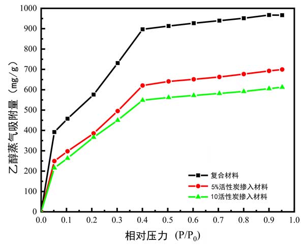 圖3:復合材料和活性炭的摻入在30℃乙醇蒸氣的吸附等溫線。