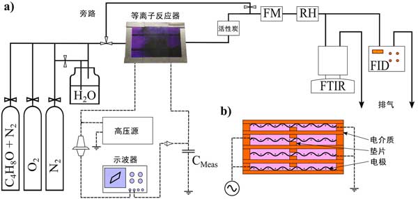圖1:(a)實驗裝置(b)等離子體反應器的示意圖。
