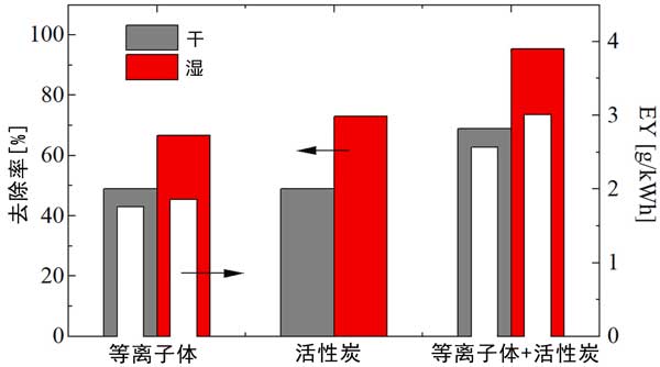 圖2:在干燥和潮濕條件下,單獨使用等離子體、活性炭和使用活性炭的等離子體對甲乙酮的去除(彩色條)和能量產率(白色條)。