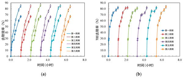 活性炭光催化劑在連續(xù)循環(huán)中持續(xù)保持其對(duì)苯胺和苯并噻唑去除的催化活性的能力對(duì)其實(shí)際應(yīng)用至關(guān)重要。因此,活性炭光催化劑經(jīng)歷了六次使用循環(huán)。如圖4所示,光催化劑在連續(xù)六個(gè)1小時(shí)反應(yīng)循環(huán)后顯示出相似的催化活性,保持84.7%的苯胺初級(jí)降解和67.0%的苯并噻唑初級(jí)降解,以及81.6%的礦化。