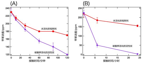 為了研究在此處使用的條件下K2CO3活化的活性炭是否可以完全去除甲苯,觀察甲苯濃度24小時。圖3b顯示了24小時觀察期間甲苯濃度與時間的關(guān)系。活性炭顯然能夠從空氣中吸附大量氣態(tài)甲苯。吸附24小時后的最終甲苯濃度非常低,僅檢測到痕量的甲苯。相比之下,當(dāng)使用未活化的吸附劑時,即使在吸附24小時后,仍有相當(dāng)數(shù)量的甲苯(160ppm)。