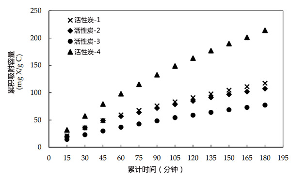 活性炭是去除有機(jī)物的常用吸附劑。吸附性能主要取決于其比表面積和微孔結(jié)構(gòu)。它們具有較高的內(nèi)部孔隙率,因此具有較高的吸附性。在本研究中,對(duì)四種具有不同表面性質(zhì)的顆粒活性炭樣品(活性炭-1、2、3和4)進(jìn)行了去除黃藥的測(cè)試。將兩克活性炭樣品與50毫升1590毫克/升的黃藥溶液混合15分鐘。過濾活性炭,并用紫外-可見光譜法測(cè)量溶液中的殘余黃藥。通過重復(fù)使用碳樣品,重復(fù)該程序12次,以達(dá)到大吸附量。如圖1所示,活性炭-4的吸附容量比較高,因此選擇其進(jìn)行進(jìn)一步研究。