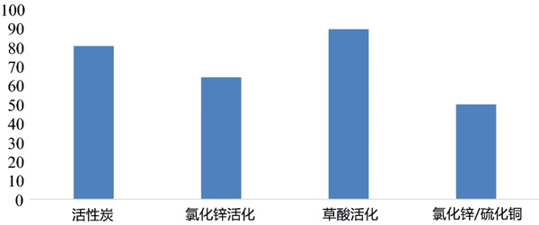 原材料用蒸餾水洗滌數(shù)次,然后干燥24小時,然后將原料通過電動研磨機(jī)獲得的粉末。將100g樣品與1L草酸(20%w/w)一起回流180分鐘,然后讓混合物在室溫下冷卻。將出售的部分通過過濾分離,以除去任何過量的草酸,將該固體與250mL/2M鹽酸一起加熱90分鐘。然后,對新混合物進(jìn)行多次過濾并用蒸餾水沖洗以得到干凈的固體,以除去樣品中存在的任何水分,將固體在130℃的烘箱中放置30小時。最后,為保證樣品的均勻性,將干燥的固體研磨過篩,得到草酸活化的活性炭粉末。對含有100g原料和1L20%w/w氯化鋅酸性溶液的混合物以及100g原料和20%w/w氯化鋅酸性溶液和50g銅的混合物重復(fù)相同的程序。得到的氯化鋅活化的活性炭和氯化鋅/硫化銅活化的活性炭。總計三種活化方式制成的活性炭吸附劑。