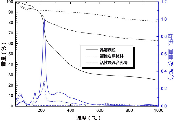 由于這種粘合劑對于這一特定應用的新穎性,有必要首先研究原料顆粒的碳化。圖2顯示了在非氧化氣氛下活性炭前體和僅有粘合劑的生粒料在非氧化氣氛下的熱行為。椰殼炭在所研究的溫度范圍內非常穩定,在1000℃時僅減輕17.7%的重量,其中幾乎一半(8%)對應于水分的釋放;钚蕴壳绑w的這種低揮發性排放形成對比。在相同溫度下觀察到乳清重量損失70%。這意味著焦炭產量約為。30%的乳清粘合劑在1000℃。乳清顆粒的大部分揮發性排放發生在低于600℃的溫度下,在175至275℃之間觀察到大量重量損失。在類似條件下獲得的純α-乳糖或乳清蛋白的熱曲線中不存在這種熱事件。據推測,這種特殊的熱行為可能是美拉德聚合物或樹脂的特征。這種新粘合劑的其他次要事件歸因于結晶α-乳糖的脫水等。