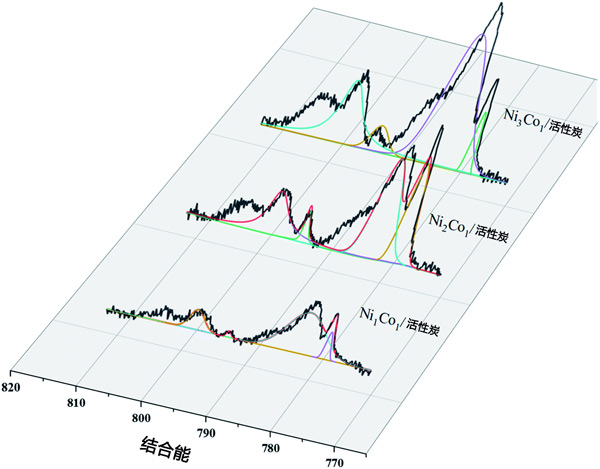 采用X射線光電子能譜(XPS)對多種活性炭催化劑進行表面分析,并對鎳和鈷進行表征氧化態。Ni02p光譜表現出兩個貢獻,2p1/2和2p3/2(由自旋軌道分裂產生),分別位于870eV和852.4eV(圖1a-d),可以分配給存在金屬鎳。O1s峰和Ni2+的存在,這可以通過在873.8eV(Ni2+2p1/2)和852.8eV(Ni2+2p3/2)的主峰上觀察到的肩峰來證明,表明樣品在暴露于大氣層。類似地,催化劑中Co2p的XPS光譜(圖2)顯示出四個主峰,結合能分別為778.45eV、782.7eV、793.66eV和798eV,對應于Co02p3/2、Co2+2p3/2,Co02p1/2和Co2+2p1/2。此外,根據載鎳活性炭,已觀察到載鎳鈷活性炭的結合能偏移隨著鈷負載量的增加而增加,最大偏移約為0.3eV。在比較這些樣品時,從載鎳活性炭到載鎳鈷活性炭向更高結合能的轉變提供了鎳、鈷和載體物質之間相互作用的證據。