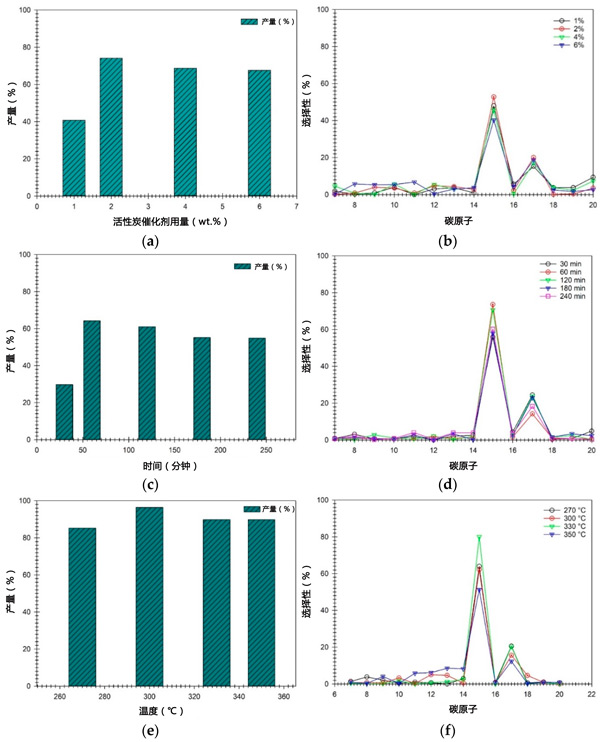 活性炭催化劑負載對烴類轉化和產物分化的影響如圖3a、b所示。脫氧反應在惰性N2氣氛中在300℃的反應溫度和500rpm的攪拌速度下進行30分鐘。評估了催化劑負載量(即1-6wt.%)的影響。數據表明,脫氧性能和分化均在1-2wt.%的活性炭催化劑負載范圍內升高,但隨后在催化劑負載>2wt.%后下降。產率和產物選擇性當使用2wt.%時,其效果更好,即分別為47.13%和72.85%。相反,在催化劑負載量超過2wt.%時,脫氧性能和選擇性的下降可能反映了催化劑的負載過重,由于不同的活性位點的剩余活性位點,這將促進對二級和并行反應的驅動。