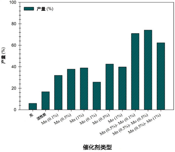 當廢油對Mn/活性炭和Mn-Mo/活性炭催化劑樣品進行脫氧反應時,產物包括液態正烷烴和烯烴,以及含氧中間體物質,例如醇,醛和酮,以及汽化的CO和CO2。單獨或兩種活性炭金屬催化劑生產提供了優異的轉化和完全差異化在廢油的溶解氧過程。活性炭催化劑的反應性能主要取決于Mn和Mo表面密度以及催化劑的酸度。脫氧反應在300℃的反應溫度和500rpm的攪拌速度下在惰性N2中進行30分鐘氣氛。對活性炭上Mn和Mo負載百分比的篩選表明,與0.1wt.%相比,將活性炭負載0.5wt.%將烴產率從31.9%提高到37.9%,并將Mo負載量從0.1wt.%提高至0.5wt.%導致產率從25.7%增加到42.4%。篩選結果表明,最佳的錳負載百分比為0.5wt.%,并選擇了此百分比。Mo對Mn催化劑的影響從0.1到1wt.%負載百分比進行了研究,結果表明0.5wt.%的Mn和Mo是合適百分比,烴收率為74%(圖2)。