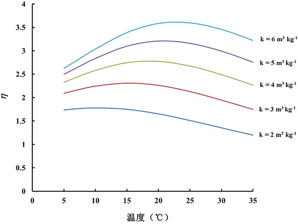 查看活性炭的檢測器的結果(圖2)可以看出,相同溫度下的CF0在活性炭之間存在差異。這意味著不同活性炭的吸附能力存在一些差異。在所有模塊設計中,假設21℃下的吸附容量值為4m3/kg-1。然而,由于我們的實驗結果表明不同活性炭材料的k可能存在差異。不同k值的結果如圖3所示。可以看出,對于區間2-6m3/kg-1內的所有k值,η的變化(例如最大/最小比率)與溫度的變化遠小于未包裝傳感器觀察到的230-305%的變化。