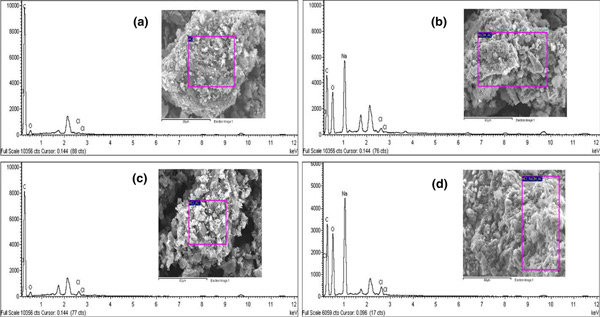 圖2:a活性炭、b堿處理的活性炭、c吸附后的活性炭和d吸附后的堿處理活性炭SEM-EDX示意圖。