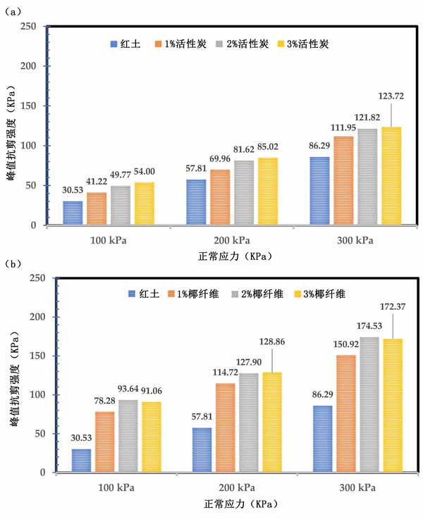 活性炭試樣的剪切強度與剪切應變的關系。峰值剪切強度隨著正應力的增加而提高,特別是300kPa正應力。此外,添加活性炭增加了峰值剪切強度,并且增強率隨著法向應力的增加而增加,如圖4a所示。同樣,添加0.5%的椰殼纖維進一步提高了活性炭穩定土的峰值剪切強度,如圖4b所示。雖然在天然紅土中添加活性炭會增加峰值強度,但對于超過2%的活性炭,增加率并不顯著。例如,活性炭穩定土的峰值強度分別為2%和3%活性炭的121.8kPa和123.72kPa。總體而言,與本研究的結果相似。發現在石灰穩定土壤中使用椰殼纖維可進一步提高抗拉強度和抗壓強度。還觀察到,椰殼纖維的加入提高了膨脹土中的兩個剪切參數。