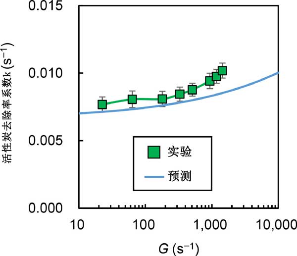 我們研究了混合強(qiáng)度對(duì)去除率系數(shù)(k)的影響(圖1)。我們繪制了實(shí)驗(yàn)數(shù)據(jù),實(shí)線顯示了方程式預(yù)測的值。實(shí)驗(yàn)結(jié)果和預(yù)測結(jié)果都表明,去除率系數(shù)隨著混合強(qiáng)度的增加而增加,但在G>1000s-1的范圍內(nèi),實(shí)驗(yàn)結(jié)果的增加率變得更陡峭,偏離預(yù)測的速率系數(shù)值。我們假設(shè)偏差背后的急劇增加是由于活性炭顆粒在高混合強(qiáng)度下的分解(在給炭時(shí)輕度聚集)。這些預(yù)測是在假設(shè)活性炭顆粒的尺寸(部分聚集在原料懸浮液中)在給炭后保持不變的情況下做出的,因?yàn)樵活w粒尺寸測量是不可能的。如果這個(gè)假設(shè)是正確的,那么去除率系數(shù)隨著混合強(qiáng)度的急劇增加,在高G對(duì)于在給炭時(shí)已經(jīng)處于分散狀態(tài)的活性炭顆粒,不應(yīng)觀察到-值范圍。為了驗(yàn)證這一假設(shè),我們使用了非聚集活性炭,其粒徑在分散處理前后沒有變化,我們?cè)诓煌幕旌蠌?qiáng)度。我們沒有觀察到隨著活性炭混合強(qiáng)度的增加,去除率系數(shù)的急劇增加,強(qiáng)烈表明觀察到的活性炭的急劇增加是由于高混合條件下的顆粒分解。