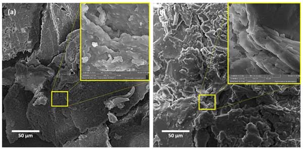 圖2:含有合適佳濃度(a)石蠟和活性炭和(b)石蠟+聚乙二醇+活性炭的相變材料樣品的SEM圖像。