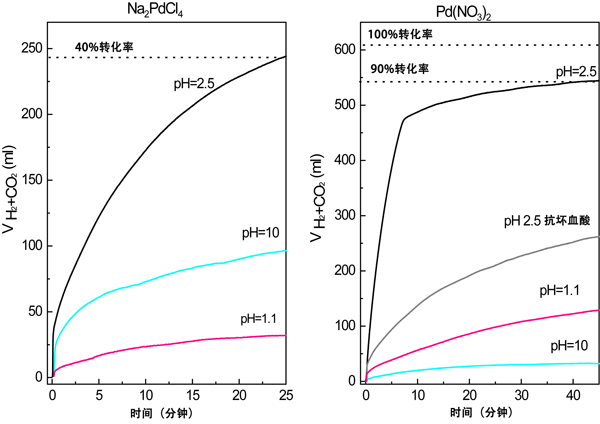 兩種不同的Pd前驅體在不同浸漬pH下制備的活性炭催化劑在60℃時產生的重整氣體(H2+CO2)的體積隨時間的變化曲線圖在圖2顯示。由于甲酸鈉添加劑對甲酸脫氫的促進作用,催化測試在存在的情況下進行]。所有制備的樣品都顯示出研究反應的活性。正如在當前測試條件下所預期的,曲線的形狀遵循甲酸中的一級動力學。為了更好地理解析氫曲線,我們測量了不同階段的反應pH值:分散催化劑和甲酸鈉在60℃攪拌30分鐘后,注入甲酸后,當反應開始時和使用Na2PdCl4制備的催化劑系列反應25分鐘后和Pd(NO3)2系列反應40分鐘后,根據圖7所示的曲線。表明在所有樣品的反應過程中,甲酸+甲酸鈉緩沖液的初始pH值保持不變,除了使用Pd(NO3)2制備的樣品,在pH值2.5下浸漬并用銻還原。對于該樣品,反應40分鐘后的pH值為8.2,表明緩沖條件的喪失和甲酸的總消耗量與實現的90%甲酸轉化率一致。對于該系列的其余部分,pH測量值表明甲酸并未完全消耗,這與實現的轉化率一致。
