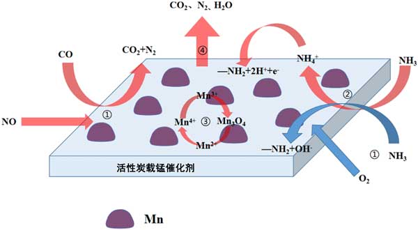 (1)CO、NH3和NO從活性炭載錳催化劑的外部連續擴散到內表面。反應氣體以吸附態吸附在催化劑表面的活性位點上,然后被活性位點活化,形成吸附態。