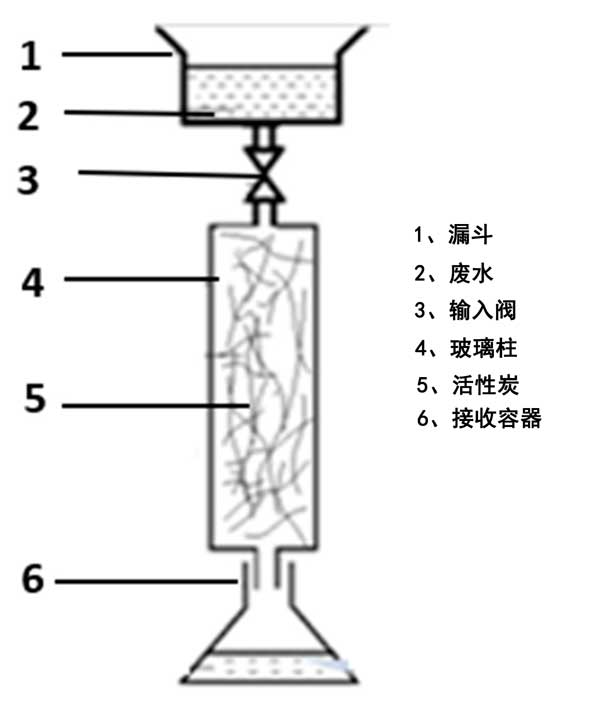 通過在密封玻璃瓶中將已知量(4.0g)的活性炭與50mL實際廢水樣品進行反應(yīng),進行批量吸附平衡實驗。測試了具有不同初始硫濃度(100、300、500、800和1000mg·L-1)的五個樣品。將瓶子在恒溫?fù)u床上放置24小時,直至達(dá)到平衡(最終pH值:10.5)。用于床吸附實驗的裝置的示意圖如圖2所示。將碳化纖維填充到玻璃柱中以研究它們的吸附能力。廢水被引入漏斗并通過輸入閥以將流量調(diào)節(jié)為4–5.10m3·h-1。首先,使用流經(jīng)柱的蒸餾水潤濕床吸附裝置以改善活性炭纖維的潤濕特性。其次,允許漏斗中的煉油廠廢水樣品內(nèi)容物通過活性炭床通過重力排放到接收容器。每小時回收處理過的水。