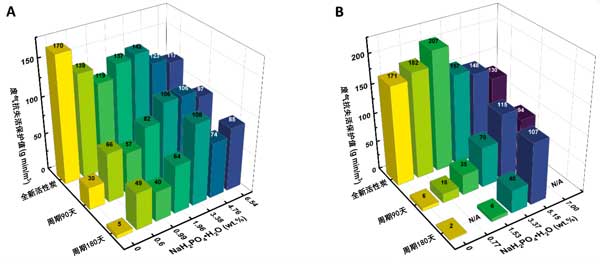 用磷酸三鈉12水合物(Na3PO4·12H2O)在活性炭上進行類似的實驗,活性炭失活后干燥。實驗在11.03wt.%的濃度下進行,相當于4.00wt.%的NaH2PO4·H2O的摩爾當量。很明顯,磷酸三鈉在抑制衰老方面并不有效。經(jīng)過3個月的加速失活,保護值甚至低于未改性的活性炭。然而,Na3PO4·12H2的效率可能會降低如果在酸性環(huán)境中或與酸或酸性化合物一起添加,效果會更好。這是因為酸性條件可以向磷酸鹽提供質(zhì)子,導致磷酸鈉有效地充當Na2HPO4或NaH2PO4。總體而言,結(jié)果表明,在由磷酸及其三種鈉鹽組成的磷酸鹽添加劑中,一元鹽NaH2PO4·H2O是抑制失活最有效的添加劑。