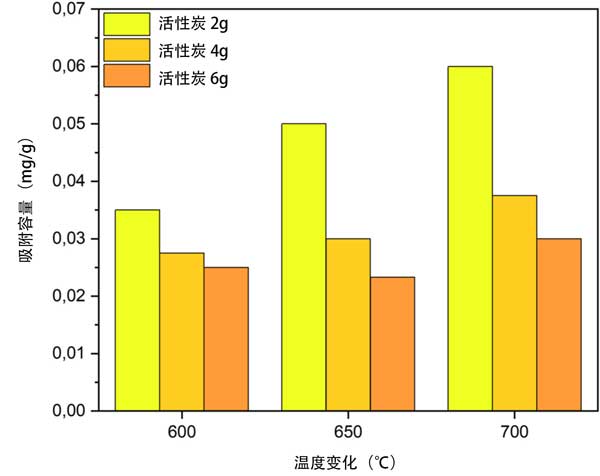 從測試結果可以看出,在700℃溫度下,吸附劑質量為6g,濃度為0.2mg/L,降低百分比為90%。氨(NH3)濃度的降低與質量變化的增加和活化溫度的升高成正比。吸附劑質量越大且溫度越高,氨(NH3)濃度降低得越多。在圖2中,顯示了活性炭的吸附容量值。因此,可以得出結論,吸附劑質量為2g、溫度為700℃時達到最高吸附容量,即0.06 mg/g。然而,盡管700℃下6g吸附劑質量顯示出氨(NH3)濃度百分比降低,但與700℃下2g吸附劑質量相比,其吸附容量仍然較低,為0.03mg/g。這是由于NH3吸附過程是由分子間相互作用驅動的,例如靜電引力、氫鍵、范德華相互作用等。此外,結果表明,源自肉豆蔻殼的活性炭可以有效降低氨(NH3)水平。那么活性炭具有良好的穩定性,并通過吸附容量值證明。