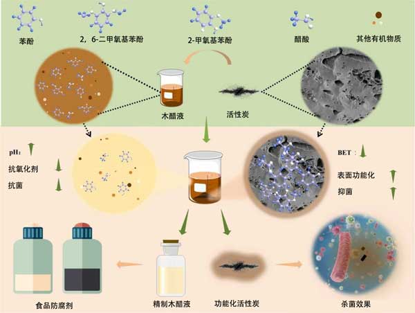 活性炭是一種多孔材料,具有較大的表面積,是多種物質的極佳吸附劑。吸附過程涉及木醋液中的分子粘附到活性炭表面。這是通過物理吸附和化學吸附實現的,物理吸附中分子由于范德華力而粘附,化學吸附中則涉及更強的化學鍵。