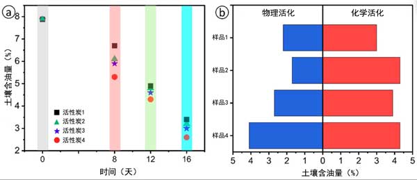 通過吸附實驗研究了活性炭樣品在污染土壤修復中的潛在用途。對活性炭對汽油、煤油和柴油的吸附能力進行了評估。在所有樣品中,活性炭1的吸附能力最高:汽油為9.3g/g,煤油為9.0g/g,柴油為10.1g/g。這些優(yōu)異的結(jié)果歸功于活性炭發(fā)達的微孔和中孔結(jié)構(gòu),氮吸附/解吸等溫線就是明證。相比之下,活性炭2的吸附能力中等,石油產(chǎn)品平均為7.0g/g,而其他的吸附能力較低,范圍為4.5至5.1g/g。所有樣品中柴油的吸附量均高于汽油和煤油,這可能是由于柴油的粘度較高,從而增強了其與碳表面的相互作用。為了在實際條件下驗證結(jié)果,將活性炭引入受油污染的土壤中,并在處理后8至16天內(nèi)定期采集樣品,以使用重量法估算油含量。圖2a顯示了土壤樣品中的初始和后續(xù)油含量。