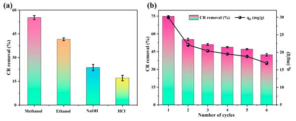 在圖4a中描述的解吸實(shí)驗(yàn)證明了溶劑類型對(duì)從支出的活性炭中去除CR的顯著影響。溶劑按降低的解吸效率順序?yàn)榧状?乙醇>NaOH>HCl,其去除效率分別為55.28%,41.56%,23.66%和17.06%。與乙醇相比,甲醇的出色性能是由于其較低的分子量和較短的烴鏈。這些特性可能有助于更有效地滲透到活性炭的孔中,從而破壞CR-活性炭相互作用。此外,其較高的極性大概有助于破壞非共價(jià)相互作用,例如氫鍵或范德華力。相反,對(duì)NaOH和HCl觀察到的較低的解吸效率表明,強(qiáng)堿或酸不容易逆轉(zhuǎn)CR-活性炭的吸附。這可能是由于較大離子物種的孔穿透有限,可能受到空間效應(yīng)或擴(kuò)散屏障的阻礙,或者是由于與Cr反應(yīng)后保留在孔中保留的不溶性沉淀物的形成。因此,選擇甲醇作為再生研究的解劑溶劑。