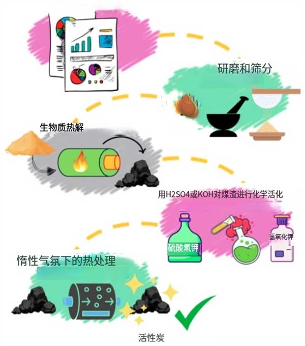 XRD和XRF分析:XRD顯示所有樣品具有非晶態石墨結構,熱解和活化條件對其結晶度影響較小。XRF分析表明,椰殼炭和活性炭中主要含有K(2.8-3.5%)、Ca(1.0-1.5%)和少量P、Mg等元素,H₂SO₄活化樣品中S含量略高(0.7%)。
