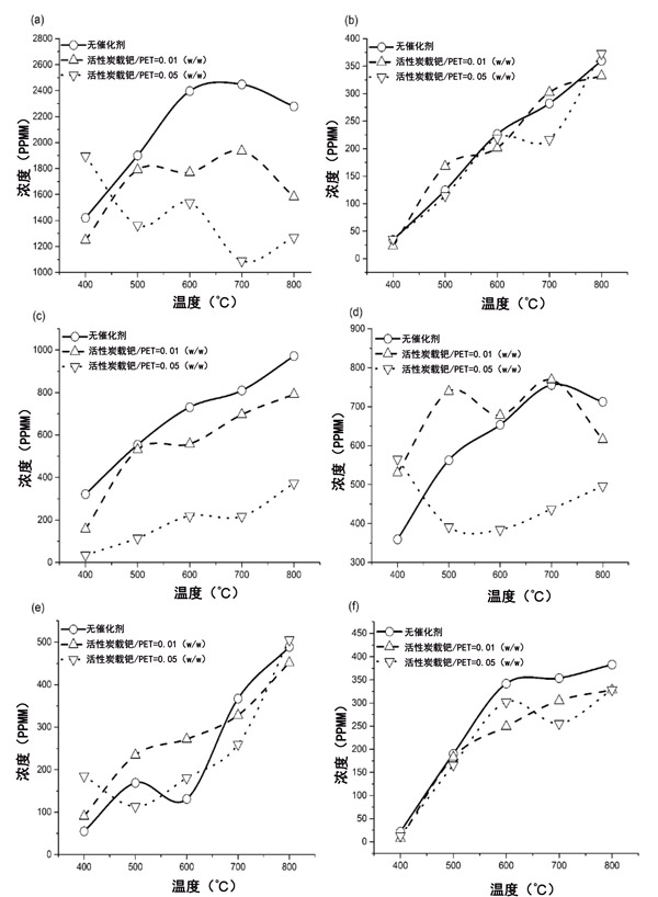圖2:在有和沒有活性炭載鈀催化劑的條件下,聚對苯二甲酸乙二酯熱解過程中總胺衍生物的濃度隨溫度的變化。
