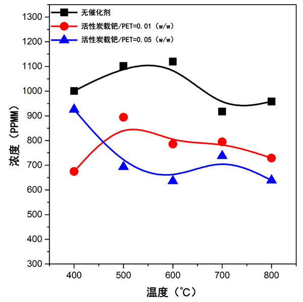 活性炭載鈀催化劑的高表面積歸因于活性炭載體。盡管金屬負載量為5 wt%,高表面積仍可實現高鈀分散度(42%)。已知活性炭具有很高的熱穩(wěn)定性,因此在熱解過程中大部分保留了活性炭的孔隙率。圖1顯示了在有和沒有鈀催化劑的情況下,由PET熱解獲得的多環(huán)烴和聯苯衍生物的濃度比較。使用不同的活性炭載鈀催化劑/PET比確定熱解過程中催化劑的作用。隨著熱解溫度的升高,三種類型的多環(huán)烴(2-萘甲酸,芴酮和三亞苯基)的濃度增加,這是因為環(huán)化反應在較高溫度下更有利地形成了苯環(huán)。