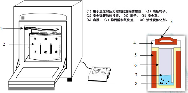 圖1是實(shí)驗(yàn)室設(shè)置的示意圖。微波消解實(shí)驗(yàn)站用于產(chǎn)生微波能量。在標(biāo)準(zhǔn)反應(yīng)運(yùn)行中,將10 mL異丙醇溶液轉(zhuǎn)移到100 mL鐵氟龍容器中。在攪拌下將所需體積的過(guò)氧化氫溶液(30%)注入到容器中。然后,將一定量的活性炭催化劑添加到該異丙醇溶液中,并在微波消解實(shí)驗(yàn)室站中照射120秒。在所有實(shí)驗(yàn)中,溶液溫度均保持在80±2°C,MW功率保持在600W。
