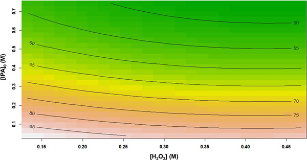圖2顯示了總有機(jī)碳去除效率百分?jǐn)?shù)與H 2 O 2濃度和初始異丙醇濃度的關(guān)系。從響應(yīng)輪廓中可以看出,將異丙醇初始濃度從0.038 M增加到0.743 M,導(dǎo)致TOC去除率從85.17%急劇降低到46.29%。可能是因?yàn)樵谙嗤膽?yīng)用反應(yīng)條件下,自由基(OH•)的數(shù)量保持恒定,而初始異丙醇濃度卻增加了。換句話說(shuō),相對(duì)較少量的氧化基團(tuán)可用于攻擊異丙醇分子。類似地,總有機(jī)碳降解性能也隨著H 2 O 2濃度的增加而逐漸降低。過(guò)量的H 2 O 2可能促進(jìn)自動(dòng)清除反應(yīng)的發(fā)生。