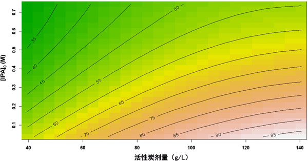 圖2:過(guò)氧化氫濃度和初始異丙醇濃度的相互作用效應(yīng)及其對(duì)總有機(jī)碳去除率的影響。活性炭的劑量保持恒定在90 g/L。