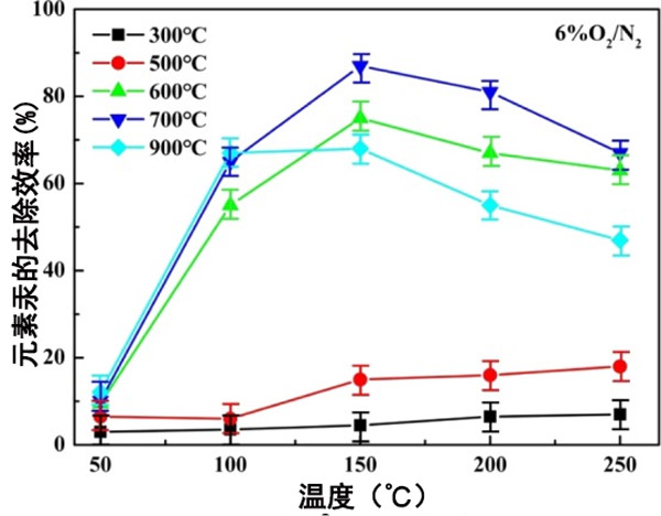 在不同的反應溫度條件下,研究了在不同熱解溫度下形成的活性炭對元素汞的去除效率。如圖所示圖2,300炭和500炭在50–250°C時表現(xiàn)出較差的元素汞去除活性,在此溫度范圍內(nèi)去除效率未達到20%以上。在較低的熱解溫度下生產(chǎn)的樣品中含氧官能團較多,并且其元素汞去除效率較差,含氧官能團在元素汞的催化氧化中并不占優(yōu)勢。這些結果可能是由于在較低溫度下熱解時在活性炭的表面孔隙不足。使用600炭,700炭和900炭時,元素汞的去除效率隨較高的反應溫度而增加,而當反應溫度進一步升高至>200°C時,元素汞的去除效率則降低。這很可能是由于抑制元素汞的物理吸附和吸附的元素汞脫附的綜合作用。當反應溫度約為150°C時,活性炭表現(xiàn)出相對較高的元素汞去除效率。