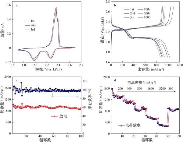 為了評估活性炭作為陰極的電化學性能,將鋰箔作為陽極組裝到鋰硫電池的紐扣電池中。用于第一,第二和第三個循環的循環伏安圖(CV)曲線上在0.05毫伏·秒的掃描速率的電位窗口進行(圖2A)。在第一循環期間,觀察到兩個陰極峰在2.26和1.97 V,CV曲線中最初的幾個循環幾乎重疊,這表明循環穩定性極佳,容量保持率相對較高。活性炭的恒電流充電/放電曲線和循環穩定性的測試中,如在圖中所描述2B、C。活性炭電極的首次放電容量為1045 mAh·g -1,約為硫理論容量的62.5%。此外,活性炭電極在第100次循環時也顯示出869.8mAh·g -1的放電容量。如圖2d所示測量活性炭的倍率性能,在200–3200 mA·g -1下表現出1260、1050、806、513、290 mAh·g -1的可逆放電容量。此外,當電流密度達到800 mA·g時,活性炭陰極的放電容量為802 mAh·g -1。多孔活性炭材料表現出中等的鋰硫電池電化學性能,顯示出高性能鋰硫電池的潛力。