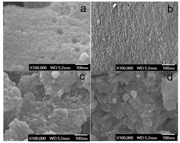 首先是電子顯微鏡,圖1顯示了活性炭(a),高溫活化后的活性炭(b),鎢浸漬活性炭(c)和鎢浸漬活性炭載鉑催化劑(d)的形態。SEM圖像(圖1a)顯示了在CO 2氣氛下在800℃下氣化的固體炭的形態。其多孔表面是由高溫下的CO 2蝕刻過程所貢獻的。高溫活化后的活性炭變得高度多孔,在1000°C碳化后,炭中形成了更多的孔和通道(圖2b)。鎢浸漬活性炭樣品中原始的活性炭結構似乎消失了(圖1c),因為在高溫下活性炭和氧化鎢之間的碳熱還原反應破壞了活性炭結構。活性炭的壁表面嵌入了直徑在3到10 nm之間的納米粒子(圖1c),根據XRD結果,這意味著這些納米粒子應為碳化鎢結構。在鎢浸漬活性炭樣品中加入1.0%鉑后,表面形態無明顯變化(圖1d)。