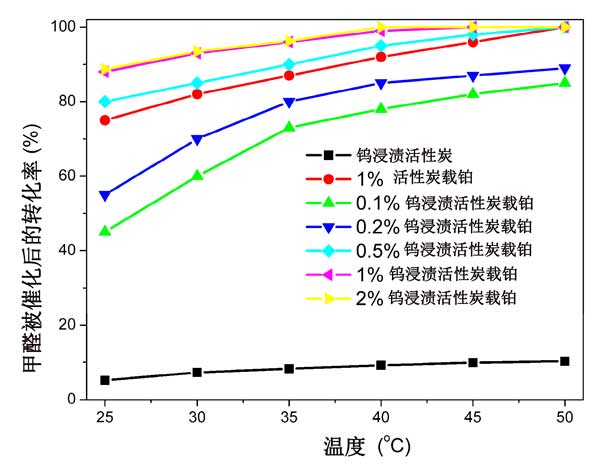 圖2:使用不同的鉑負載活性炭催化劑,反應溫度對甲醛轉化率的影響。