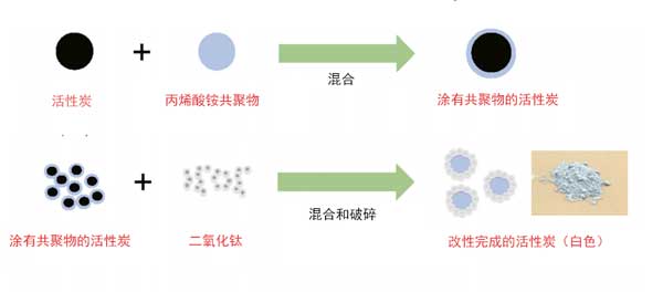 活性炭通常用作出色的多功能吸附劑。活性炭的多孔表面可通過將極薄的化合物層粘附到較大的碳表面積上來使各種化學(xué)物質(zhì)失活。它們通常用于吸附去除飲用水和工業(yè)用水中的顏色,氣味,味道和不良有機和無機污染物。此外,活性炭常用于許多化學(xué),食品和其他物質(zhì)的純化。因此,基于我們的發(fā)現(xiàn),活性炭對各種產(chǎn)生體味的化合物表現(xiàn)出高吸附能力,改性后更強。將平均直徑為9.4或40.5μm的活性炭粉與丙烯酸銨共聚物溶液在超純水中完全混合。將平均直徑為0.25μm的二氧化鈦粉末以5-20g的不同濃度添加到混合物中,以制造相應(yīng)的改性活性炭。在115℃下將樣品干燥2小時后,使用破碎機通過均勻研磨獲得除異味活性炭(圖1)。并且比較了活性炭與除異味活性炭中所含活性炭的吸附能力。