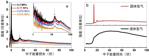 在非彈性中子散射實驗中,使用普通氫在三個碳原子上的原位氫劑量(圖2)。圖2a顯示了鈦活性炭中氫氣在0.3MPa壓力下的INS光譜,表明在0meV處有清晰的峰歸因于固定(固態(tài))和部分移動(液態(tài))氫的彈性和準(zhǔn)彈性散射。在圖2中以對數(shù)能量軸查看的光譜a顯示了在不同壓力負(fù)載下,活性炭上吸附的H2在14.7meV處的旋轉(zhuǎn)峰。我們先前在石墨活性炭上出現(xiàn)轉(zhuǎn)子峰的情況,該峰對應(yīng)于固體中從對向或從正向旋轉(zhuǎn)躍遷的氫。14.7meV峰的存在表明氫分子處于以下狀態(tài):它們在三個維度上固定并且表現(xiàn)為自由轉(zhuǎn)子,因此近似于固體。