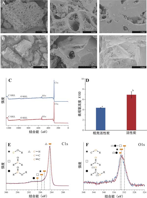 圖1:(A)欖殼活性炭和(B)活性炭在一系列放大倍數下的SEM顯微照片,(C)XPS調查掃描,(D)表觀氧元素濃度,(E)碳信號,(F)氧濃度之間的顯著差異。