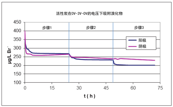 圖4:在三步實驗中的溴化物濃度,第二步對應于在3V下進行24h的陽極和陰極電吸附實驗。在第二步中施加3V電壓24h,然后將其再次置于開路狀態(tài)24h。