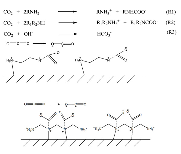 圖2:胺官能化活性炭表面上的乙二胺和三亞乙基四胺與二氧化碳之間的擬議反應機理。