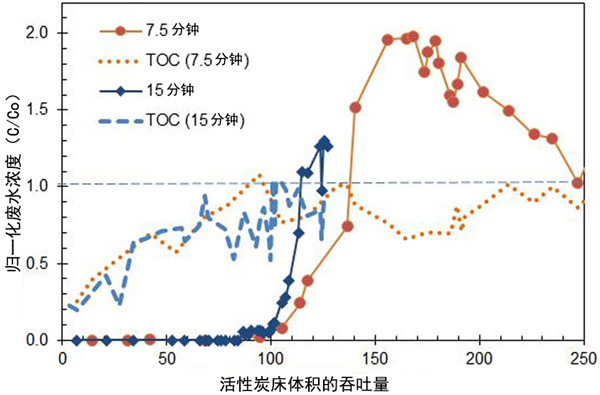 空床接觸時(shí)間對(duì)突破的影響說明如下:圖2用于123-三氯丙烷。盡管7.5分鐘和15分鐘EBCT的123-三氯丙烷突破的開始是相似的,但在100,000床體積之后,與7.5分鐘EBCT相比,15分鐘EBCT的突破更早。更長(zhǎng)的EBCT容量降低可能是活性炭結(jié)垢的結(jié)果,這是由于更強(qiáng)的吸附力和不可置換的DOM到達(dá)吸附床的更深處,并超過了目標(biāo)有機(jī)物的吸附位點(diǎn)和/或覆蓋了活性炭顆粒的孔而導(dǎo)致的。時(shí)間并防止進(jìn)一步的目標(biāo)有機(jī)物吸附。通過比較相似突破點(diǎn)的吞吐能力差異,說明了EBCT對(duì)其他cVOC的活性炭性能的影響,其中負(fù)值表示在15分鐘EBCT時(shí)容量更大,正值表示在7.5分鐘EBCT時(shí)容量更大(或在15分鐘EBCT時(shí)容量較小)。床體積數(shù)量達(dá)到突破的10%,50%或75%的平均容量差異(不包括VC,因?yàn)槲丛u(píng)估15分鐘EBCT)分別為-0.1%,9%和13%,表明在運(yùn)行時(shí)容量沒有損失。15分鐘的EBCT突破了10%,突破了適度的容量,因?yàn)楦L(zhǎng)的EBCT結(jié)垢了,因此突破了50%和75%。