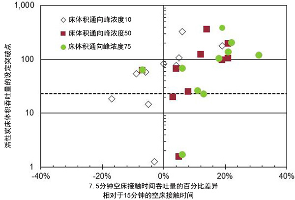 圖2:空床接觸時(shí)間對(duì)吞吐率的影響達(dá)到10%,50%和75%的突破。